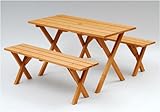 ●シンプルデザインのテーブル&ベンチ3点セット ●天然木のやさしい雰囲気を演出 ●テーブル中央パラソル用ホール有(径40mm)